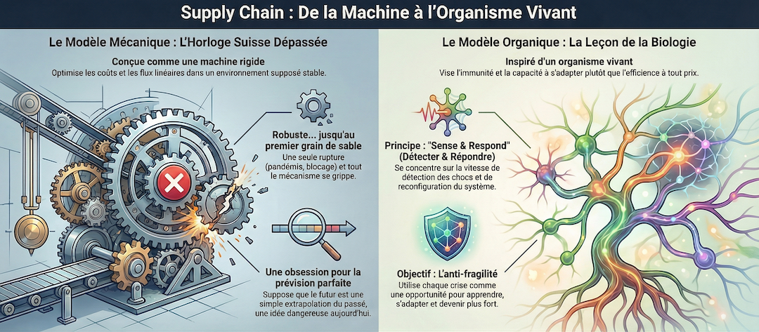 La nature, elle, n’optimise pas des machines, elle fait évoluer des organismes. Un organisme est imparfait, redondant, parfois “inefficient” en apparence, mais il sait encaisser les chocs, muter, se régénérer. C’est cette logique organique qui doit inspirer l’architecture de la Supply Chain de demain.